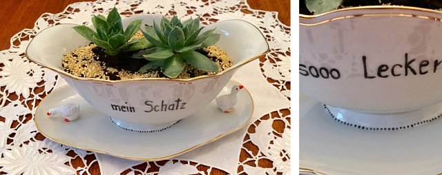 "Nun machen wir es uns gemütlich." grosser ovaler Teller, Plastikpalme, 36cm x 26cm, handbeschriftet.
