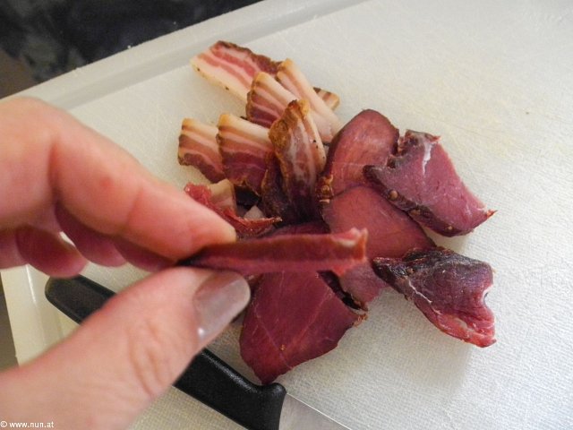 Tag 4: Crashkurs in Schwiizerdütsch. Richard "Schinken mag ich am Liebsten als Möckli." Nach dem x-ten Anlauf ist das Werk vollbracht und Richard ist glücklich. Möckli = Bröckchen.